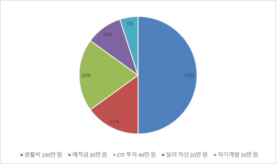 | 생활비 | 100만 원 | 50% | 고정지출: 식비, 교통비, 통신비 등 |